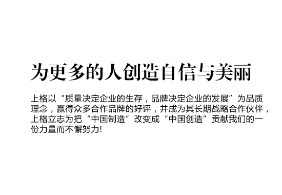 上格一路走來,以“締造時尚集團,使公司受人尊敬,令人向往;為客戶提升價值,創(chuàng)造成功;讓員工提高生活品質(zhì),實現(xiàn)自我價值”作為我們的目標(biāo),“為更多的創(chuàng)造自信與美麗” 作為我們的使命,立志為把“中國制造” 改變成“中國創(chuàng)造”貢獻(xiàn)我們的一份力量而不懈努力!
